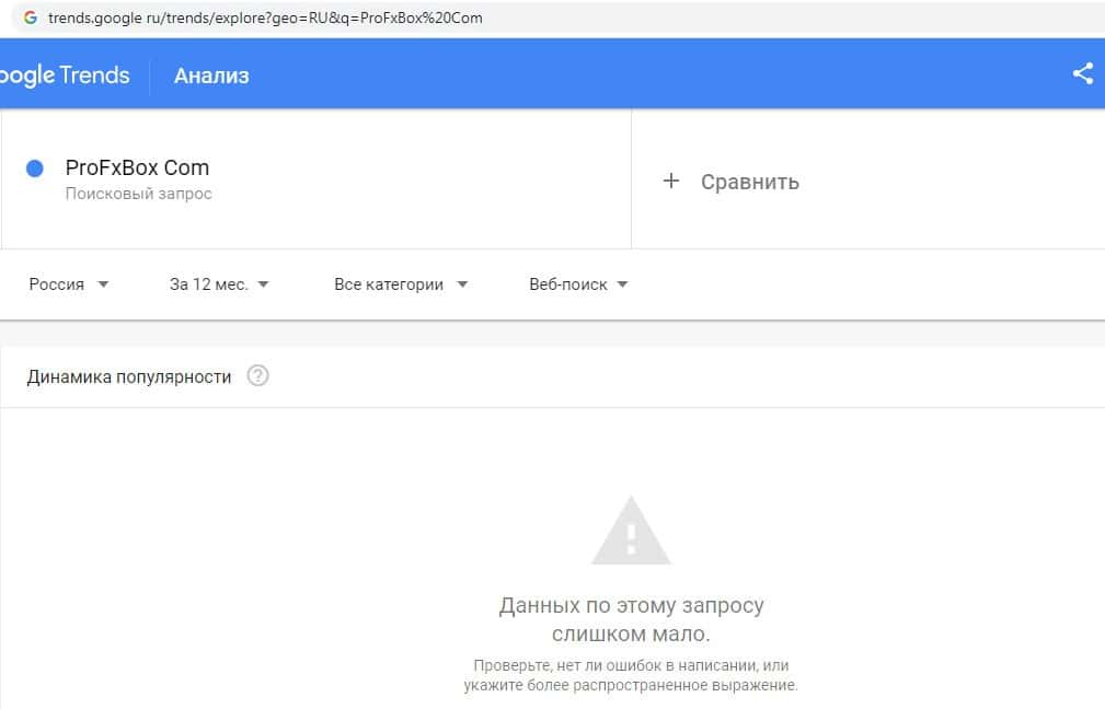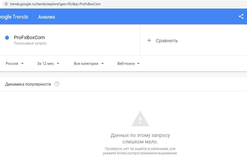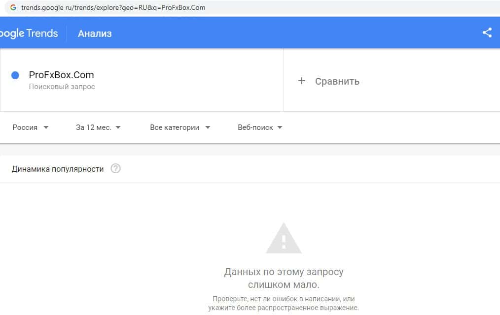 Дальше ищем запрос в Google на английском языке без пробелов с точкой "ProFxBox.Com". Google выдает нам результат - 0 показов за месяц.