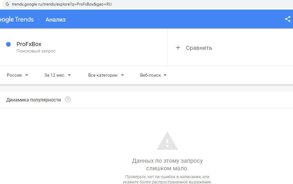 Для начала рассмотрим запросы в Google на английском языке. Первый запрос без пробелов "ProFxBox" выдает результат - 0 показов за месяц. Так жуликов не искали.