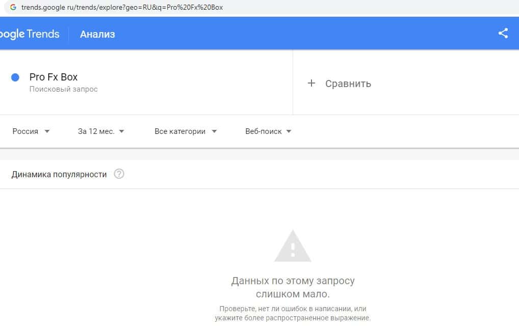 Третий запрос в Google на английском языке с двумя пробелами "Pro Fx Box". Google нам выдал результат - 0 показов за месяц. И так тоже жуликов не искали в сети.