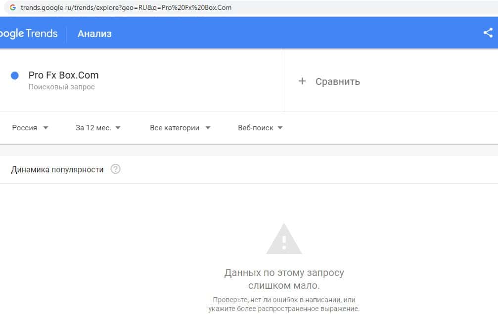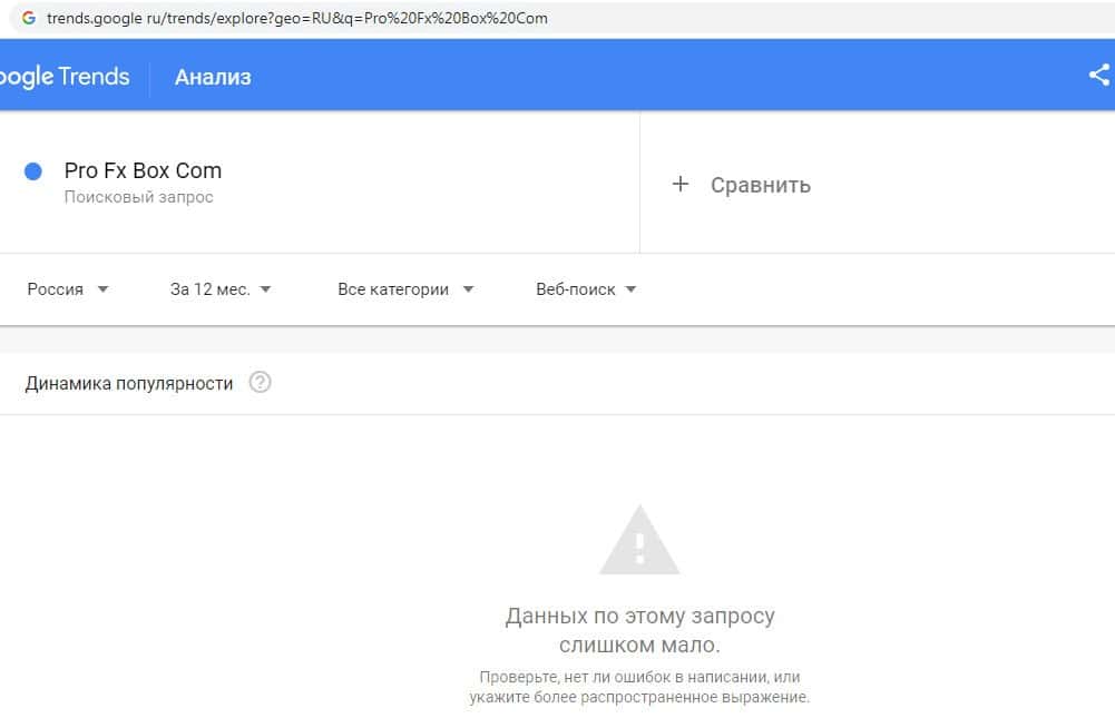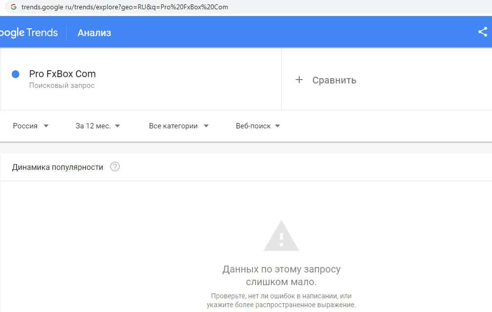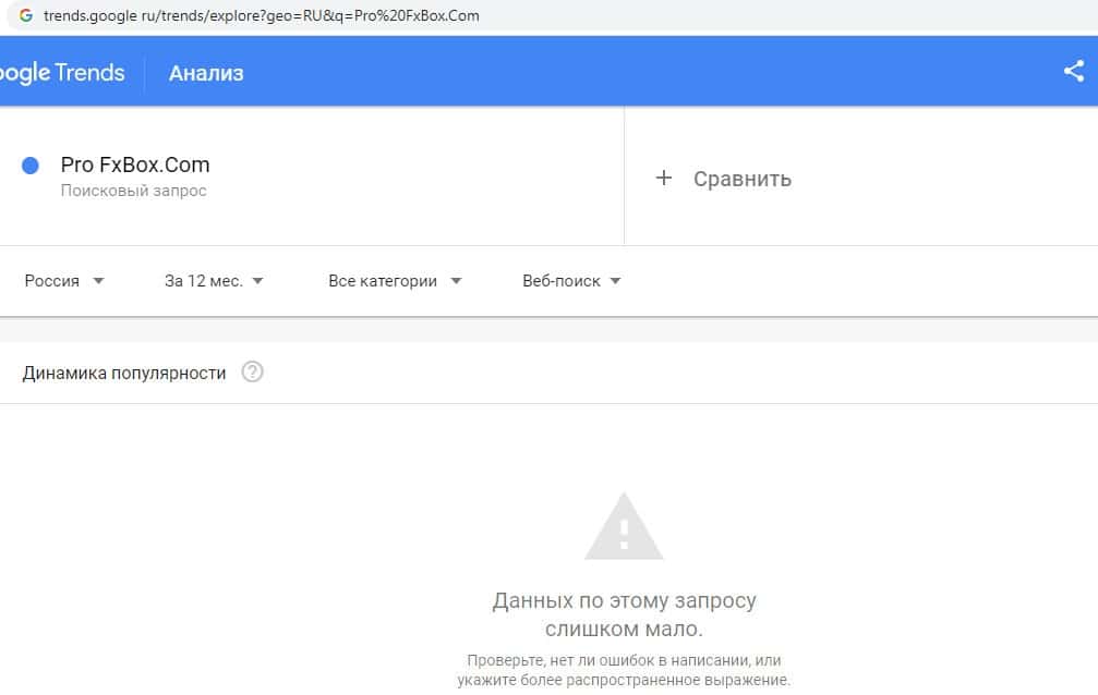 Шестой запрос в Google на английском языке с двумя пробелами "Pro FxBox Com". Google выдал тот же результат - 0 показов за месяц. Шарагу так не искал никто.