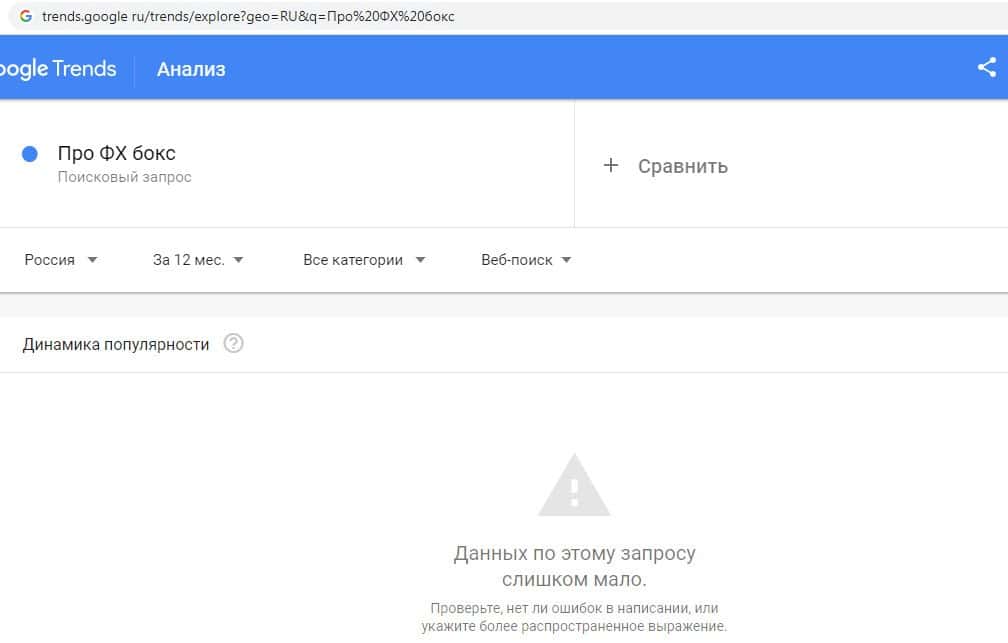 Переходим к запросам на русском языке. Первый запрос с двумя пробелами "Про ФХ бокс". Google выдал результат - 0 показов за месяц. Таким образом шарагу не искали.