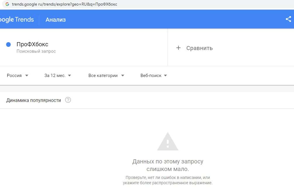 И последний запрос на русском языке без пробелов "ПроФХбокс". Google выдал результат - 0 показов за месяц. Жулики не пользуются популярностью среди пользователей сети!