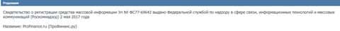 Вместо лицензии на ведение брокерской деятельности, лохотрон Pro Finance Service выставило на показ свидетельство о регистрации средства массовой информации Эл № ФС77-69642 выдано Федеральной службой по надзору в сфере связи, информационных технологий и массовых коммуникаций. Но это не дает право быть дилинговым центром.