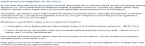 Касательно самого договора от лохотрона Pro Finance Service, здесь ничего не предоставлено, есть только условия использования материалов их ресурса. Получается что контора настолько за шифровалась, что когда человек переведет им деньги для торговли, то здесь к мошенникам никаких предъяв предоставить не сможешь.