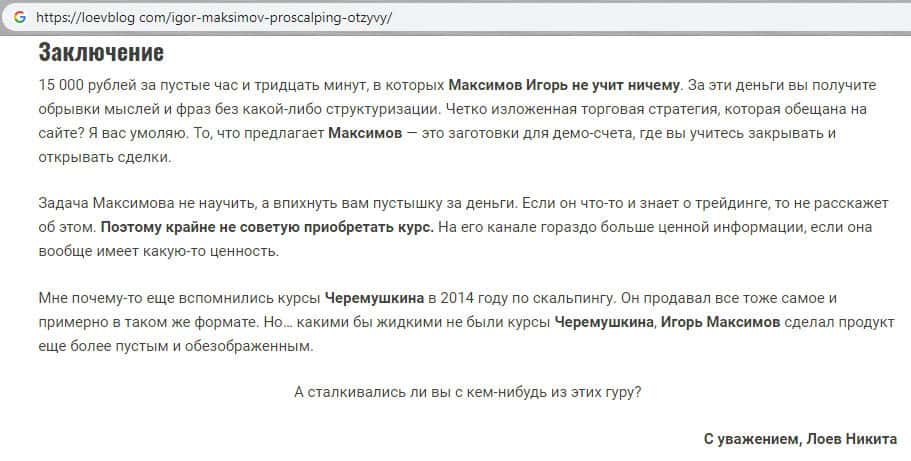 Сайт в сети высказал своё мнение по поводу курса и работы компании Про Скальпинг