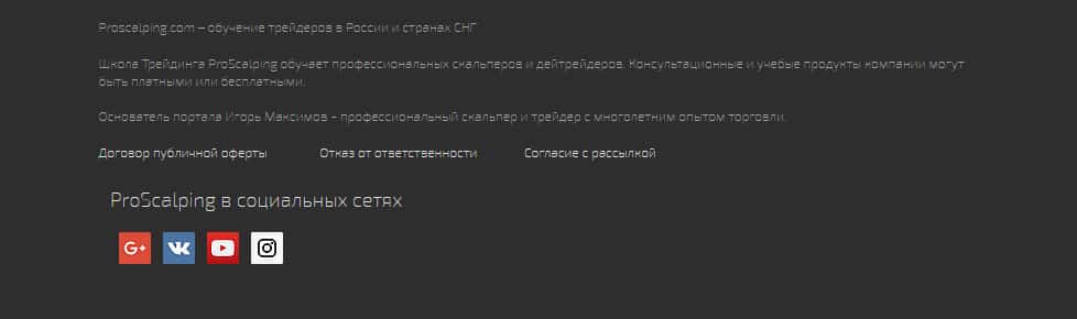 В конце своего днищенского сайта, шулера ProScalping расположили социальные сети, которые мы рассмотрим позже, также, предлагается зайти туда, чего мы Вам не рекомендуем от слова совсем. Кроме того, в самом конце расположено множество самых вкладок, таких как "о нас" "платформа" и так далее. Что больше всего настораживает - малое количество информации.