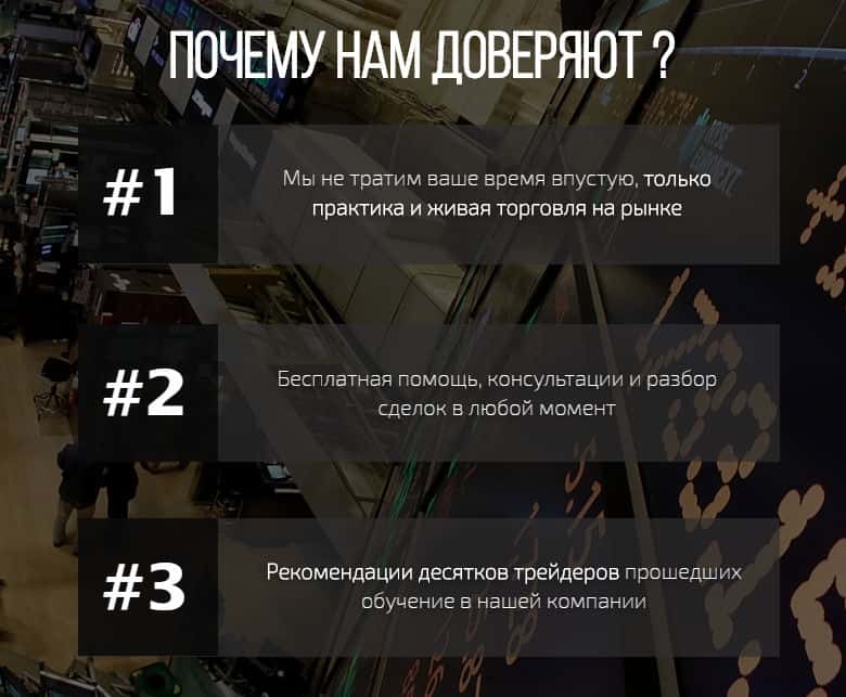 Начнем с того, почему, как говорят шулера из мошеннической конторы Про Скальпинг, им доверяют. Как они обещают на официальном сайте, они не тратят Ваше время впустую, обещая Вам практику и живую торговлю на рынке. Обещается, также, бесплатная помощь с разного рода вопросами, консультации и разборы сделок. Но всё это замануха на то, чтобы Вас привлечь.