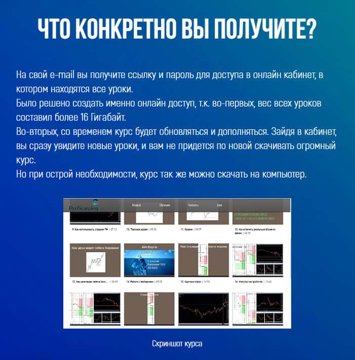 Рассмотрим, что же Вы получите, купив данный курс за пол цены, как утверждают шулера на своём мошенническом сайте конторы Про Скальпинг. А получите Вы ссылку на свой личный кабинет с паролем на курс. Также, как утверждается на сайте, было решено специально создать онлайн доступ для Вашего удобства, чтобы не качать раздутую и не нужную информацию себе.