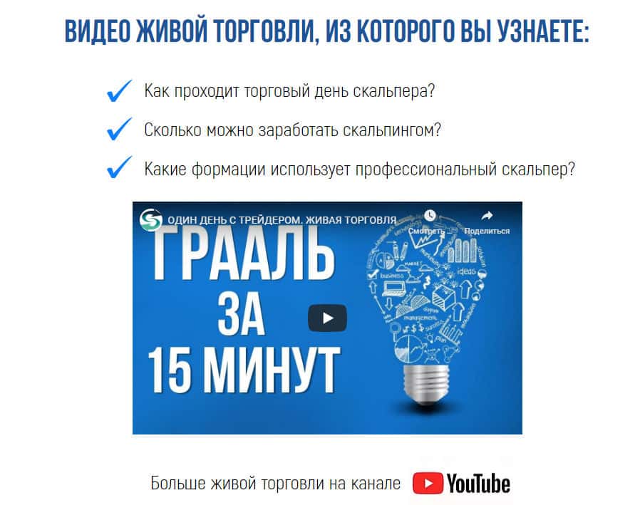 Также, для приманивания на чудо современной мысли, то, что обучит Вас за считанные минуты, существует видео ролик, в котором рассказываются все вопросы, касающиеся скальпера, а именно как походит день скальпера? Сколько можно заработать, работая скальпером? И так далее. Все ответы, которые Вы услышите, будут привлекательны, но не полезны.