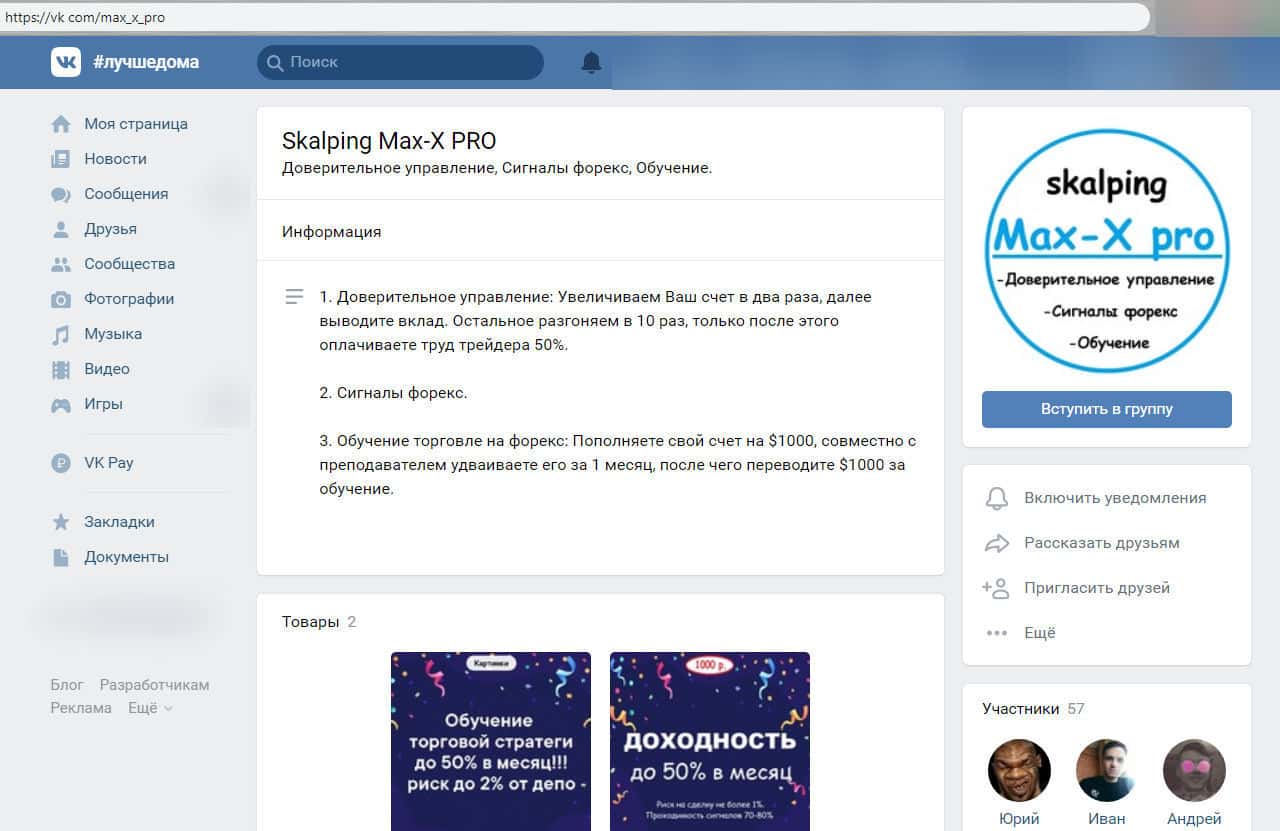- сайт мошеннической конторы в социальной сети ВКонтакте vk com/max_x_pro