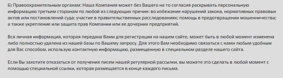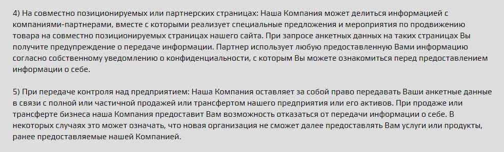 Также, для того, чтобы поддерживать связь с другими компаниями, контора использует передачу Ваших конфиденциальных данных, что является незаконным. Также, существует продажа, о чем мошенническая контора говорит открыто, и не скрывает этого от пользователей в сети интернет. Остерегайтесь мошенников. Они продадут Ваши данные когда будет возможность.