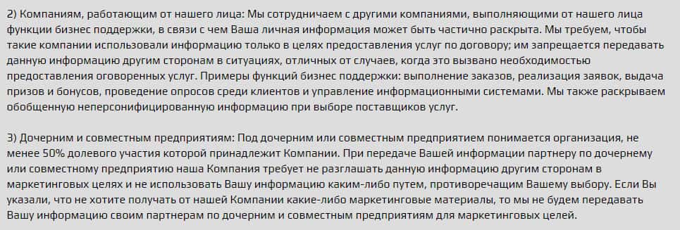 Так как контора сотрудничает с другими организациями, то они разрешают им использовать Вашу конфиденциальную информацию в своих целях, что является не совсем законно с любой стороны, как не посмотреть. Вас всегда должны уведомить о том, что Вашу конфиденциальную информацию будут разглашать третьим лицам, кто бы они не были, пусть даже сотрудниками.