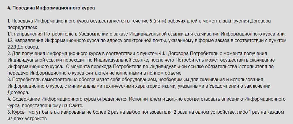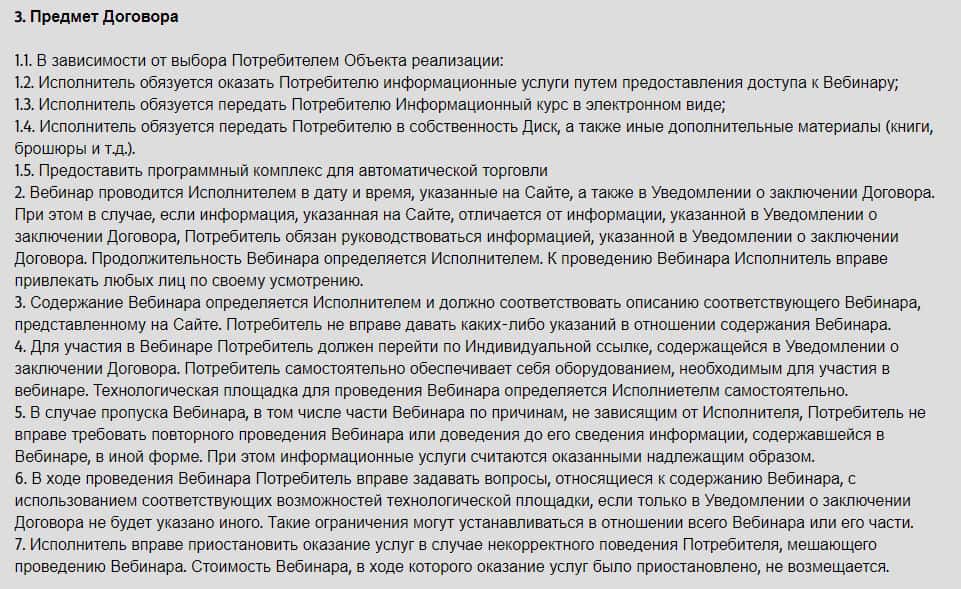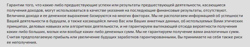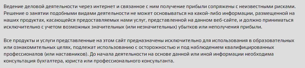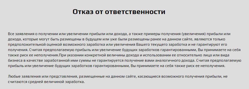 Договор об отказе от ответственности был выложен на сайте, а точнее, внизу подвального сайта. Мошенники отказываются нести какую либо ответственность за ущерб, который был причинен в результате сотрудничества с мошеннической конторой. Это означает только одно: что деньги за курсы, Вам, никто не вернет, в случае провала, так что не стоит покупать эти курсы.