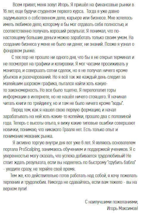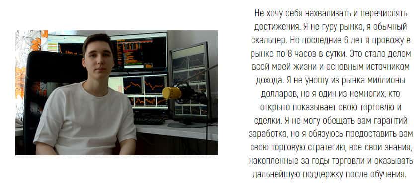Во вкладке обучения, данная личность сказал о себе ещё пару слов о том, что, цитируем "Не хочу себя нахваливать и перечислять достижения. Я не гуру рынка, я обычный скальпер. Но последние 6 лет я провожу в рынке по 8 часов в сутки. Это стало делом всей моей жизни и основным источником дохода." Звучит крайне убедительно, но, повторимся, это может быть ложь.