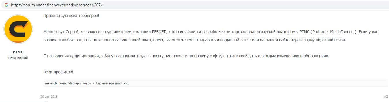 Шулера ProTrader Org нашли замечательный способ как вешать лапшу на уши людям о своей конторе. Примером этому является скриншот, который предоставлен ниже, а именно то как аферисты зарегистрировавшись на сайте forum vader finance рассказывают трейдерам о том, что их платформа якобы лучшая.