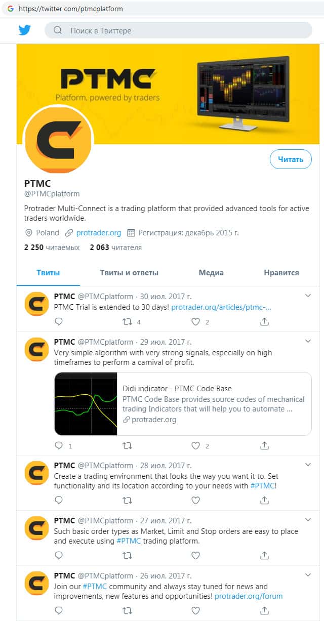 Жулики ProTrader Org так же зарегистрировались на сайте twitter com, где абсолютно вся информация о конторе на английском языке. Здесь мошенники всячески расхваливают свою торговую платформу, конечно же разместив активную ссылку на свой дырявый сайт. Но с самого сайта аферистов ссылка на Твиттер не открывается.