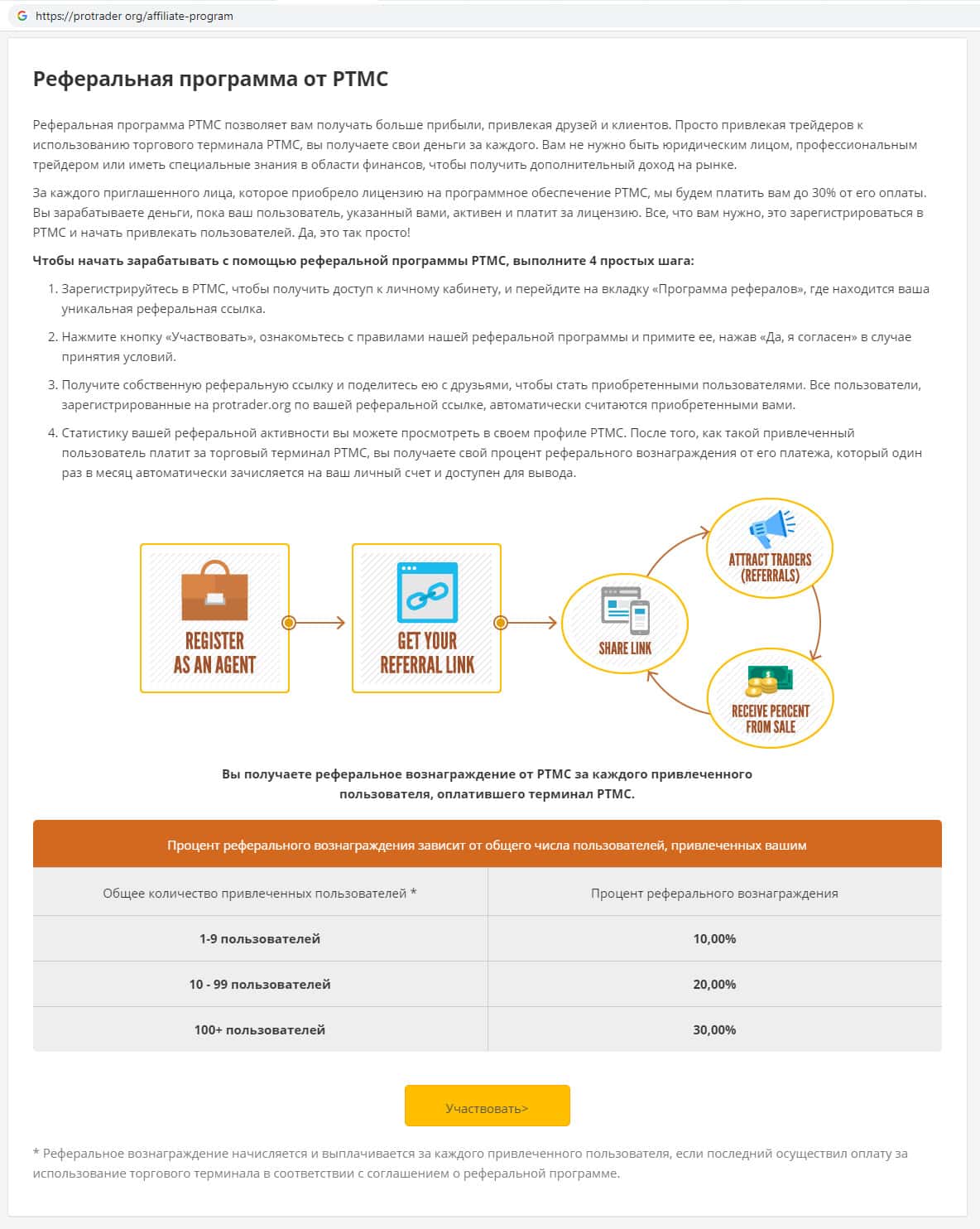Шулера Про Трейдер разработали некую рельефную программу, которая существует для привлечения как можно большего количества клиентов в их контору. Мошенники ProTrader Org предлагают за счет этого снизить комиссию за торговлю тому, кто пригласил своего друга в данную организацию.