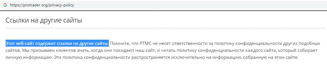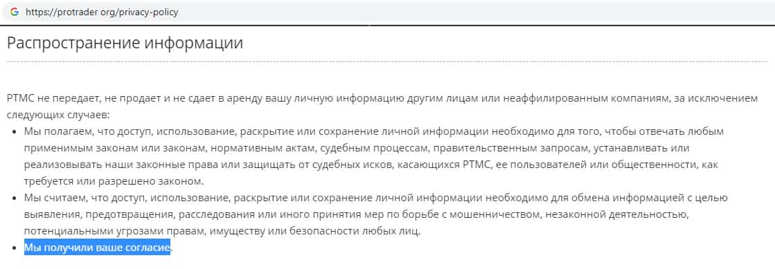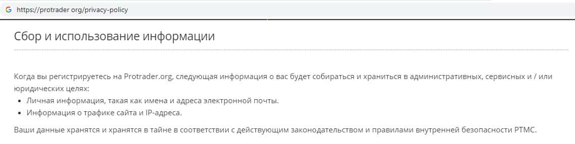 Политика конфиденциальности на сайте мошеннической организации Про Трейдер