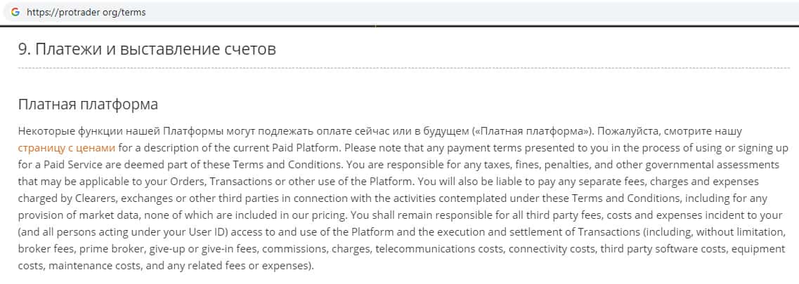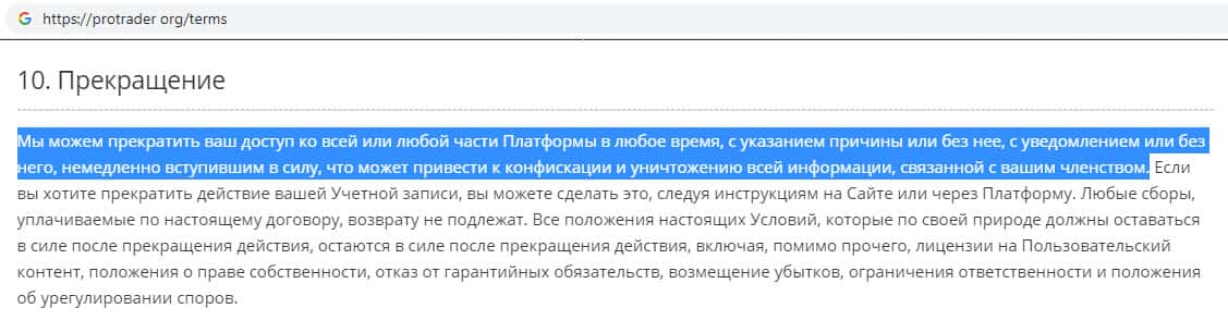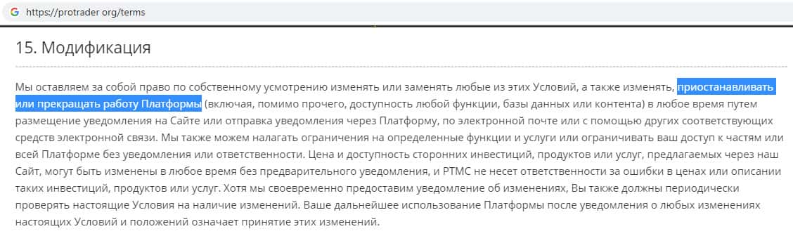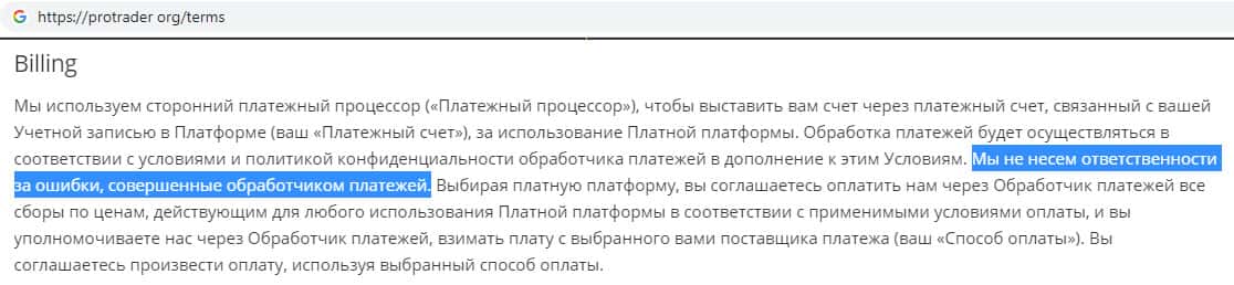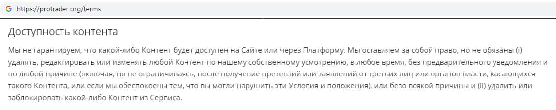 Нет никакой гарантии того, что сайт скам-конторы ProTrader Org будет стабильно работать потому, что мошенники сами пишут, что не гарантируют правильную работу их торговой платформы. К тому же аферисты Про Трейдер могут в любой удобный им момент заблокировать какой-либо контент без особой на то причины.