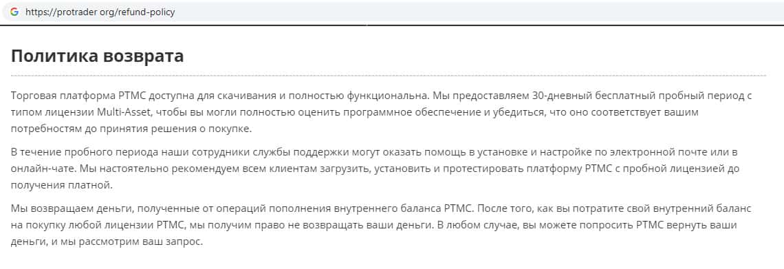 Информация о политике возврата платежей на сайте жуликов ProTrader Org