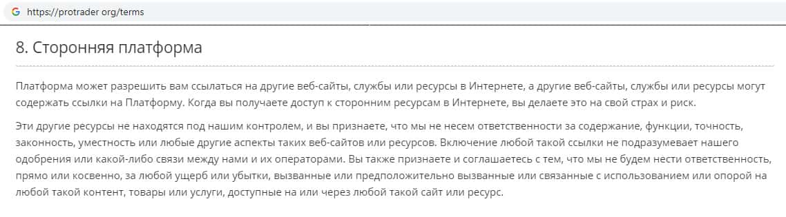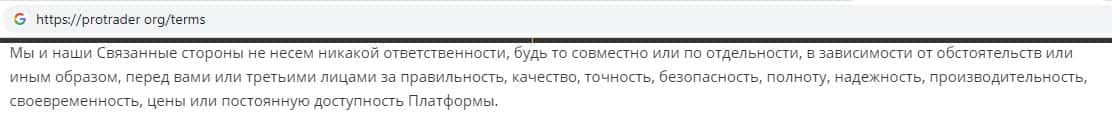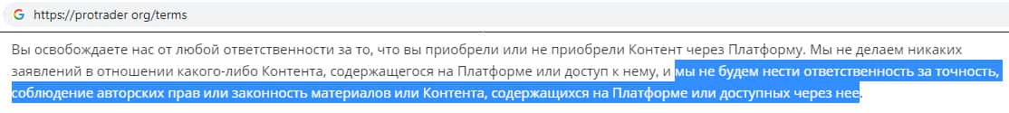 Больше всего в условиях пользования сайтом конторы Про Трейдер необходимо обратить особое внимание на этот пункт по той причине, что шулера не будут нести ответственность за точность предоставленной ими информации, законность материалов контента, а так же информации содержащейся на торговой площадке.