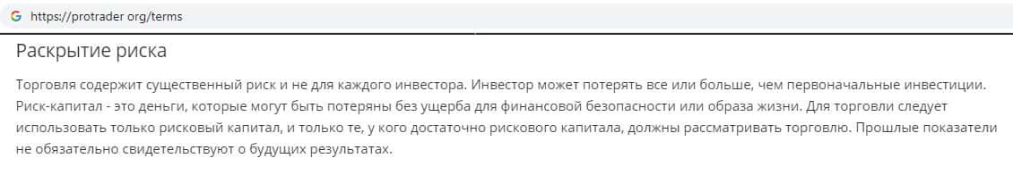 - Информация о всевозможных рисках на сайте скам-организации ProTrader Org