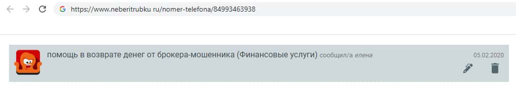 Так же с этого же номера жулики звонят клиентам и представляются фирмой по возврату денег от брокера - мошенника. Об этом свидетельствует данный отзыв, который оставил пользователь получивший этот звонок. Мошенники представляются разными компаниями и любым способом пытаются вытянуть деньги из неопытных пользователей.
