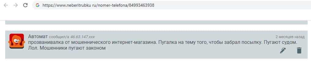 Подтверждают информацию о том, что номер компании ProTrading Su обвиняется в мошенничестве, отзывы. Вот один из них ,в котором пользователь сообщает, что ему звонили с данного номера и представились интернет - магазином, и требовали забрать посылку, а если нет, то грозили судом. Мошенники просто хотели вытянуть деньги из пользователя.