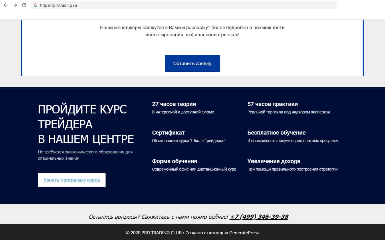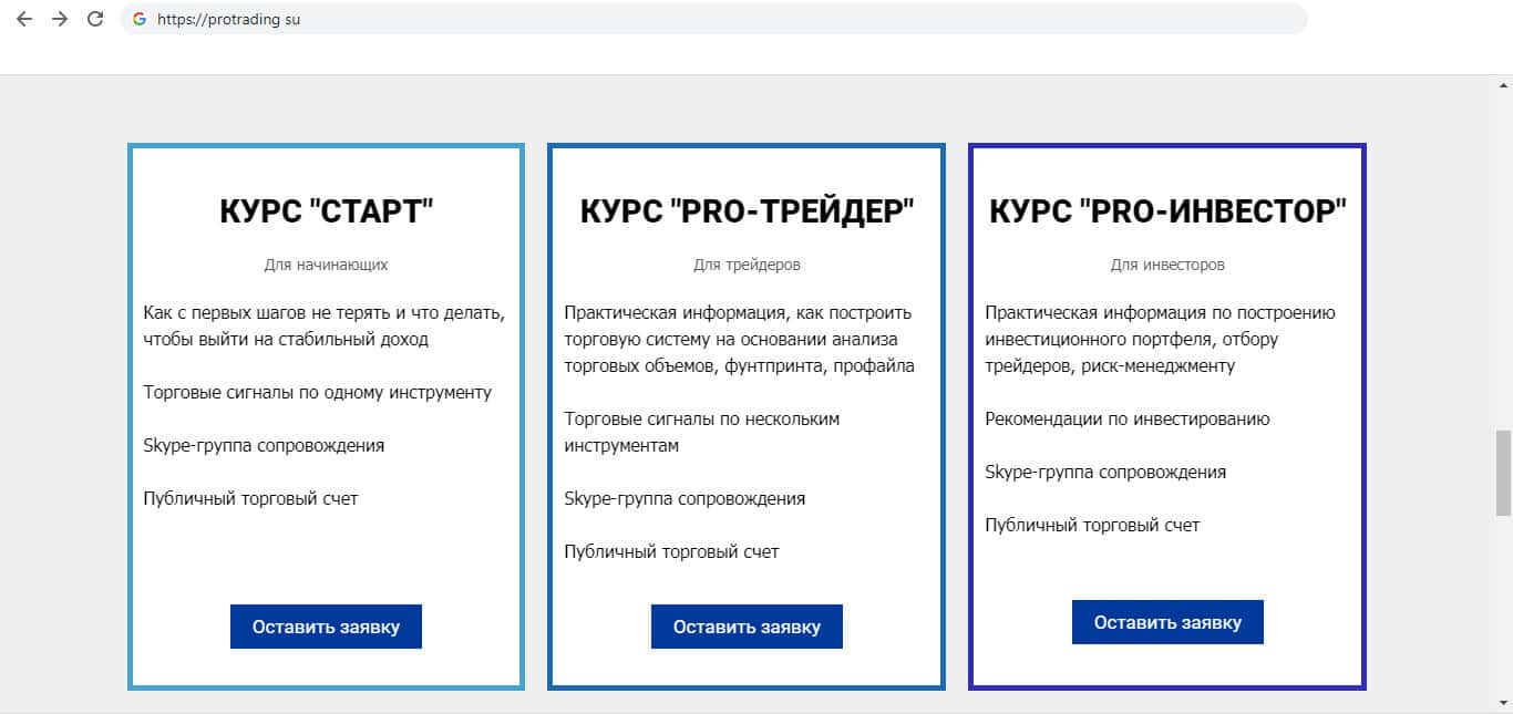 В завершении сайта компания предлагает пользователю выбрать один из счетов. Так же фирма начинает втирать пользователю то, что нужно выбирать счёт и определяться, Так же демонстрируются не выполнимые операции ,которые компания не сможет выполнить. И компания жуликов ProTrading Su рассказывает о сертификате в конце обучения, который она выдаёт.
