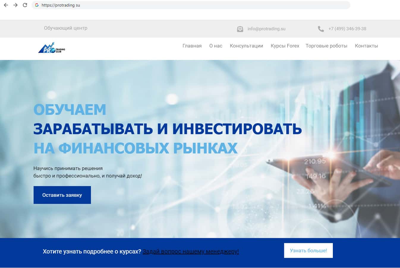 ProTrading Su - мошеннический обучающий центр. Аферисты якобы предоставляют услуги по обучению трейдингу, но на самом деле мошенники делятся с клиентами бесполезной информацией, что бы втереться в доверие, а затем сливают клиентуру мошеннической оффшорной брокерской организации Xtrade. Ни в коем случае не связывайтесь с жуликами.