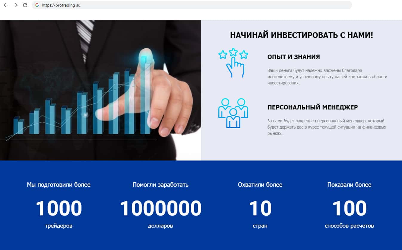 Так же компания призывает пользователей инвестировать с помощью фирмы кидал Про Трейдинг Су. Компания предлагает свой опыт и знания, а так же личного менеджера, который будет направлять клиента. Но и тут же фирма врёт о том, что уже подготовила более 1000 трейдеров, помогли заработать миллион долларов, охватили более 10 стран.