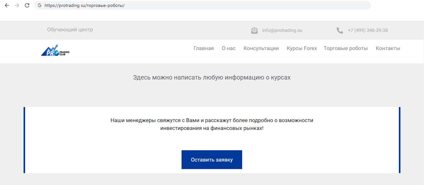 С разделом "Торговые работы" такая же ситуация...Сайт практически не представляет никакой информации. На первый взгляд на сайте есть всё, но если немного капнуть глубже, то всё становится ясно, что это всего лишь муляж. Фирме главное приманить клиента и быстро слить его брокеру, который вытянет все деньги с пользователя и отстегнёт часть кидалам Про Трейдинг Су.
