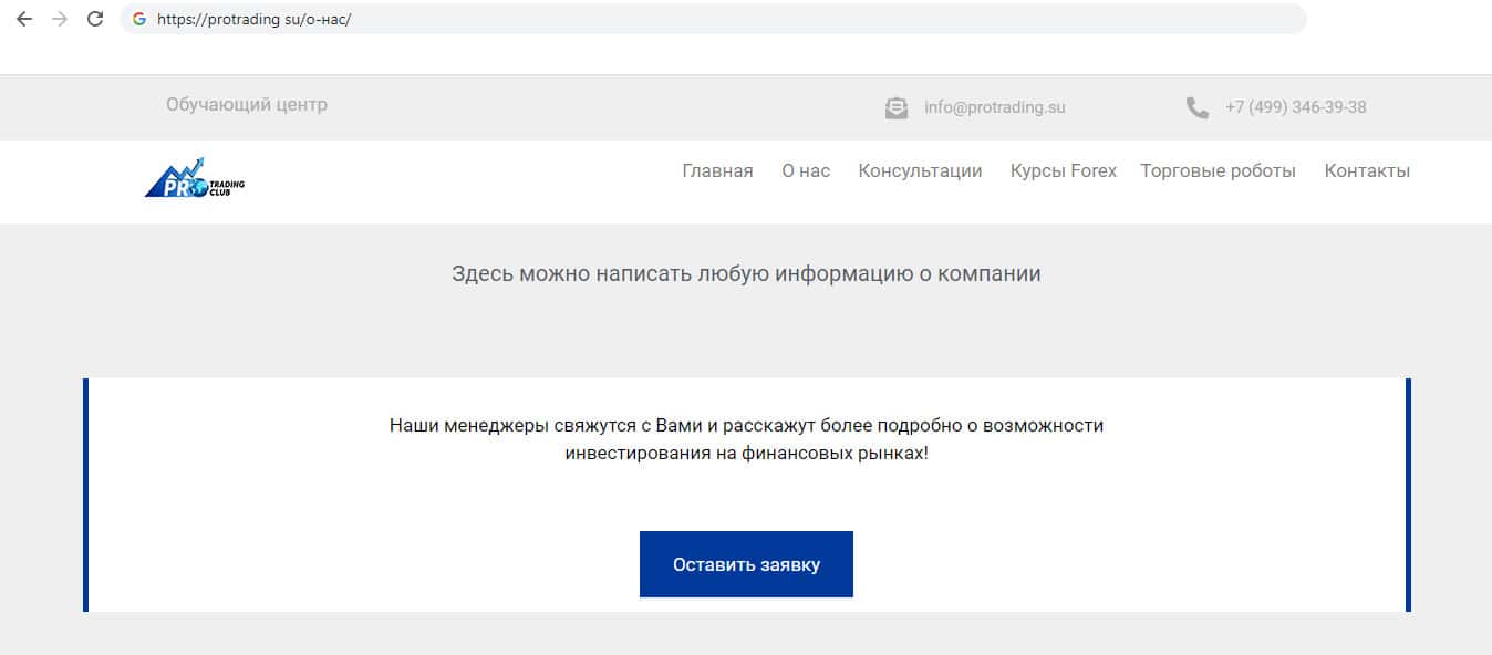 На сайте компании махинаторов ProTrading Su присутствует пункт под называнием "О нас". В нём фирма должна описать свою деятельность и рассказть чем конкретно занимается компания, но вместо этого там написано: "Здесь можно написать любую информацию о компании". Другой информации нет. Контора просто проигнорировала этот пункт.