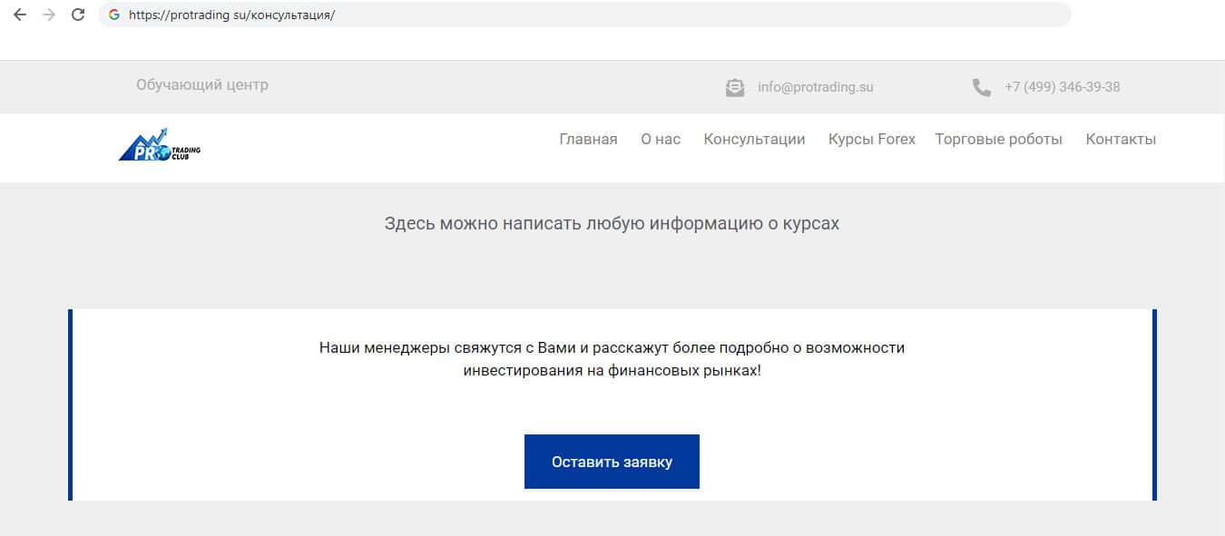 Ещё присутствует на сайте компании мошенников Про Трейдинг Су раздел под названием "консультация". Он так же пустой. Что наводит на мысль о том, что у компании ничего нет, а так же они могли создать быстро сайт и забыть всю эту документацию.