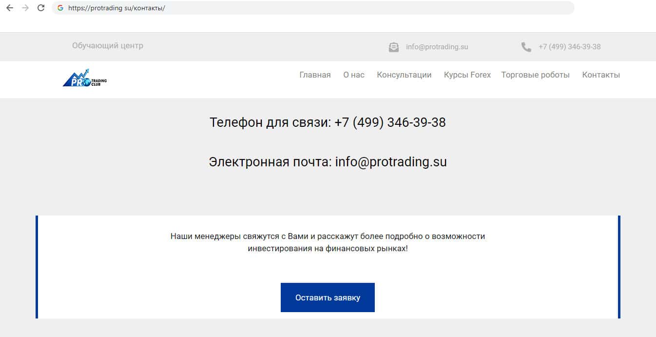 Единственный раздел сайта мошенников Про Трейдинг Су, где есть какая либо информация - это раздел контактов. Там указан номер телефона и адрес электронной почты лохотрона. По тим данным клиенты могут связываться с сотрудниками компании по личным вопросам. только почему то отсутствует адрес компании. Контактные данные лохотрона: