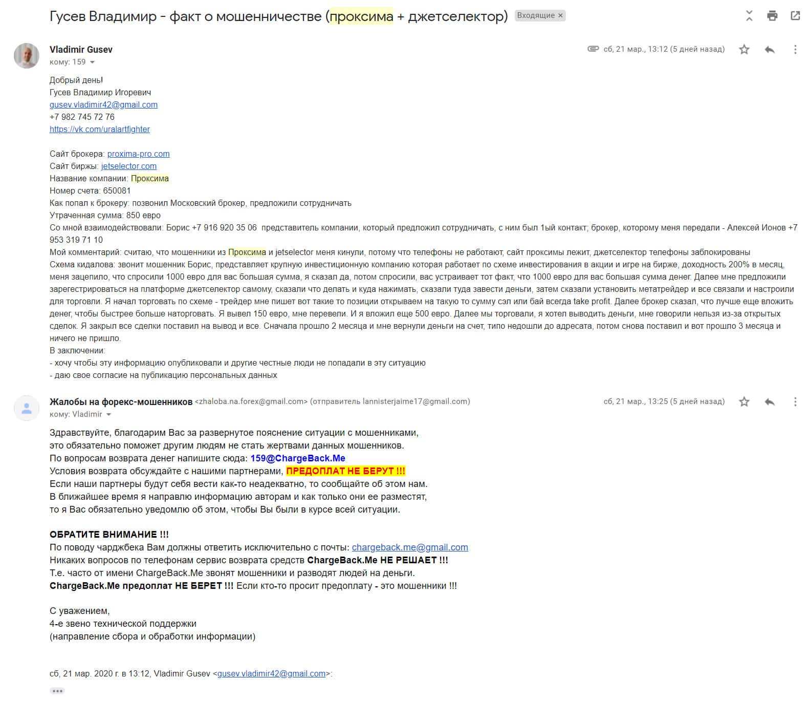 Псевдо-аналитики из Proxima-Pro обворовали трейдера на 850 долларов. Они действовали в сговоре с лже-брокером JetSelector. Злоумышленники имитировали прибыльную торговлю, и даже позволили вывести небольшую сумму. Потом предложили увеличить депозит, чтобы зарабатывать быстрее, после чего пропали. Возможные имена и контакты жуликов: