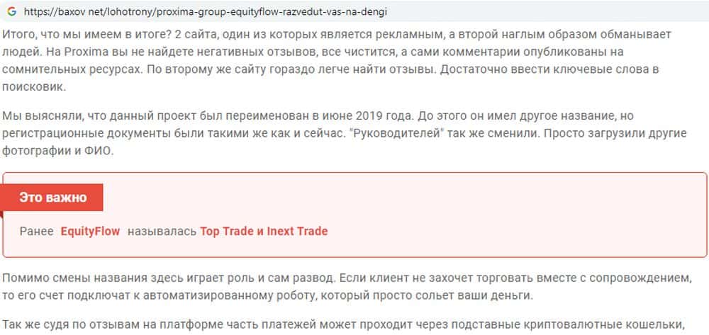 Фанерный брокер Екьюти Флов, подельник махинаторов Proxima-Pro, не первый год в злодейском деле. Темный брокер уже обворовывал трейдеров стран СНГ под именами iNext Trade и TOP Trade. Группа мошенников сворачивала один проект после шквала жалоб, и сразу же открывала другой, все время тесно сотрудничая с жуликами Proxima-Pro.