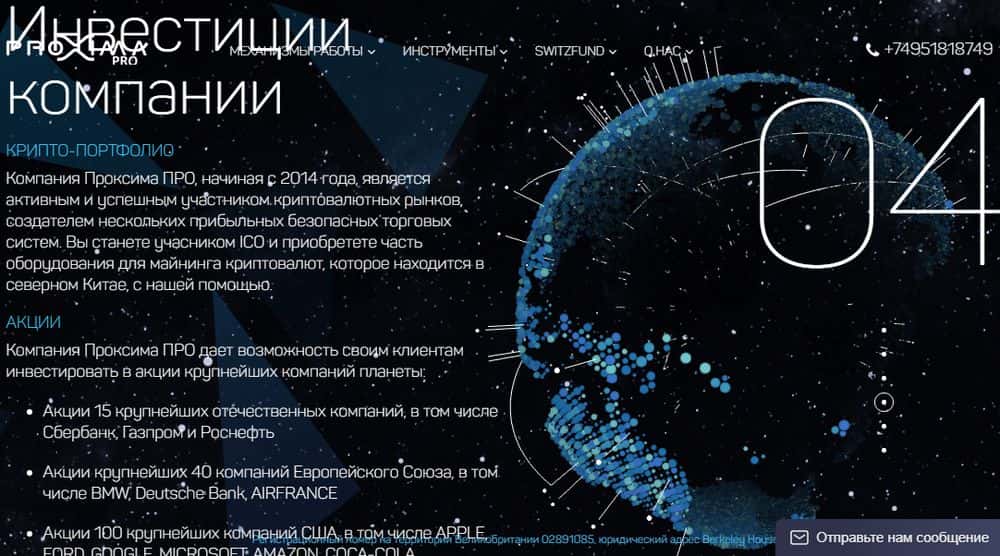 Сайт проходимцев Proxima-Pro - рекламная ловушка для наивных новичков. Никакой информации по существу жулики не предоставляют, а обещания выглядят просто смехотворно. Жулики занимаются всем - от крипты до акций, гарантируют доход в 20% в месяц и страховку рисков. Но при этом ресурс сверстан некачественно.