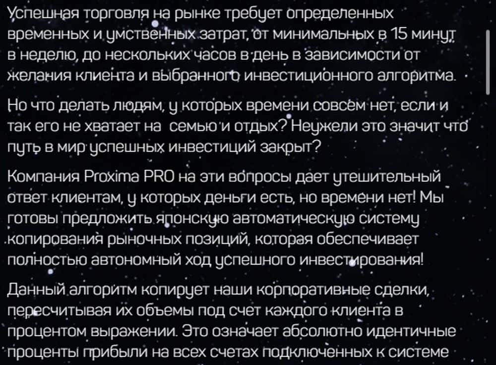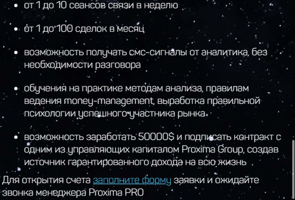 Вообще, информация на сайте предоставлена очень странно. Проходимцы Proxima-Pro рассказывают, какие услуги предоставляют, и сколько жертва заработает. А потом - форма обратной связи и приписка, что наш менеджер с вами свяжется и в телефонном режиме все подробно растолкует (ну, то есть, на деньги максимально раскрутит).
