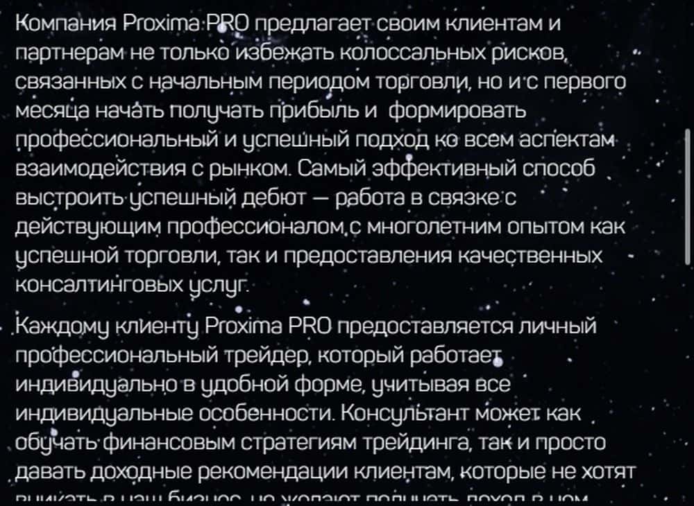 Proxima-Pro - липовый консалтинговый центр. Мошенники якобы предлагают советы и обучение трейдерам-новичкам, обещают сопровождение в сделках от опытных биржевых игроков и 20% прибыли в месяц. Обещаний своих жулики не выполняют. Проект создан, чтобы заманивать жертв и передавать их в лапы черных брокеров.