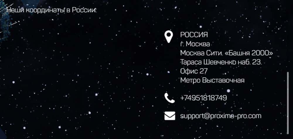 Контактными данными мошенники Проксима Про своих жертв не балуют. Трейдерам предлагают оставить номер телефона в форме обратной связи. Мошенники-менеджеры сами перезванивают с одноразовых номеров. Адреса в Москве (и прошлый, и нынешний) - фейки, офис в Великобритании к жуликам Проксима Про отношения не имеет. Контакты кидал: