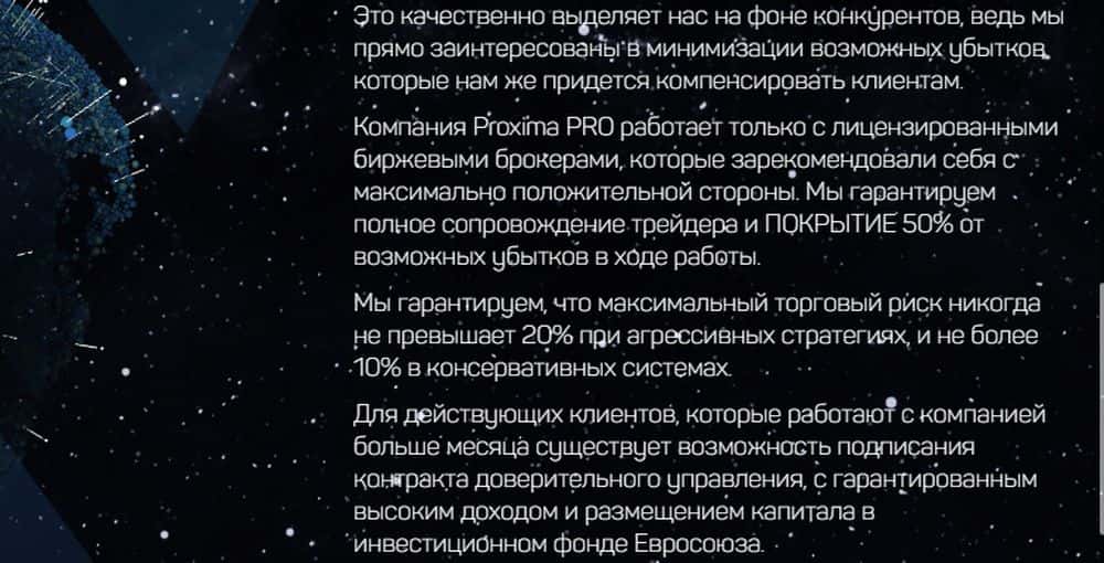 Мошенники Proxima-Pro не скупятся на обещания: гарантируют, что риски никогда не превысят 20% (что уже звучит как бред), что они работают только с лицензированными биржевыми брокерами. При этом "солидная" псевдо-контора ни слова не говорит о своих руководителях или сотрудниках, видимо, чтобы избежать расплаты за воровство.