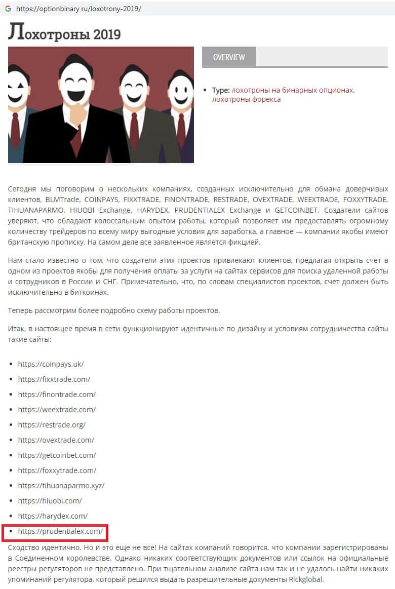 Контора Prudentialex находится в черном списке мошеннических организаций
