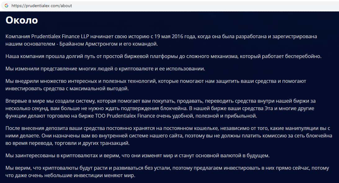 Очередным доказательством того, что Prudentialex - очередной развод является то, что здесь мошенники пишут, что их контора работает с 2017-го года, но в одном из разделов о компании написано, что она была основана в 2016-м году. Доверять сомнительной организации Прудентиалекс не рекомендуем !!!