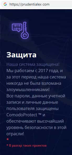 Шулера Prudentialex уверяют пользователей своего сайта в том, что их система абсолютно безопасна. Для того, чтобы им доверяли они готовы пообещать все что угодно. Доступ к учетной записи пользователя прежде всего имеет сама скам-конторы Прудентиалекс, которая в любой удобный им момент может заблокировать аккаунт без предварительного уведомления.