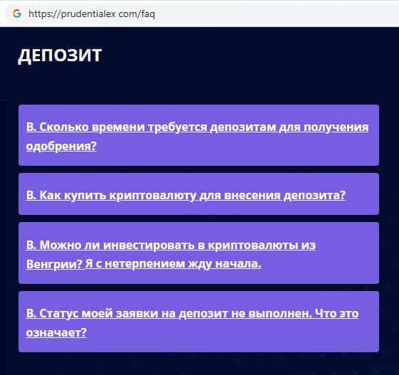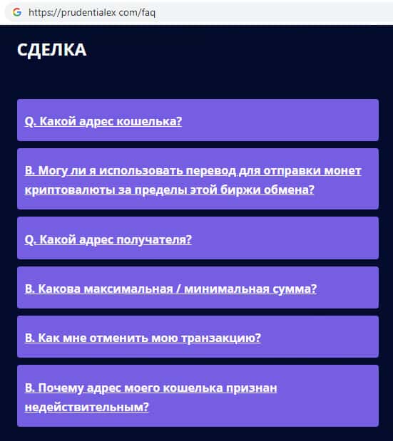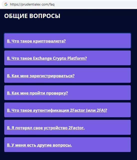 На официальном сайте жуликов Прудентиалекс были замечены уже заранее продуманные всевозможные ответы на те вопросы, которые могут задавать клиенты, например в случае неудачной сделки или же каких либо проблем связанных с работой на сайте. Достоверными ли являются ответы на вопросы знают только те, кто пострадал связавшись с Prudentialex.