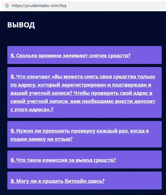 В случае возникновения каких-либо проблем связанных с выводом денежных средств, мошенники Prudentialex всегда будут ссылаться на предлагаемые ответы. Жулики Прудентиалекс аргументируют это тем, что ответы на Ваши вопросы уже прописаны и у них нет такой возможности более подробно отвечать.
