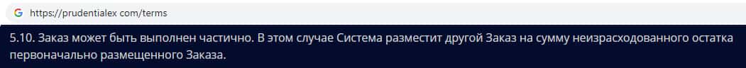 Аферисты Prudentialex в своем пользовательском соглашении уведомляют о том, что заказ может выполнен частично. Так же жулики могут вернуть не всю сумму денежных средств с торгового счета, а только лишь часть баланса. Поэтому надеяться на возможность получения какой-либо прибыли, связавшись с конторой Прудентиалекс не стоит !!!