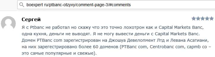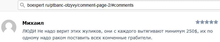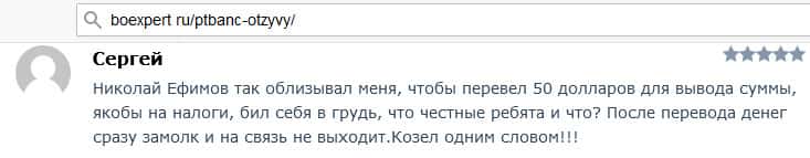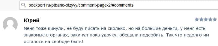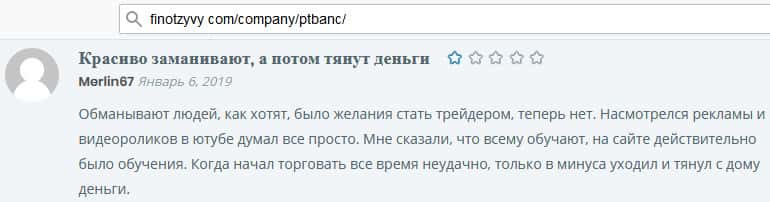 Как бы это не было абсурдно, но жулики PT Banc умудрились нагреть на своем примитивном разводе уже тысячи людей, которые отнесли им свои деньги. Стоит взглянуть на одни громкие отзывы жуликов, чтобы понять, что они из кожи вон лезут, чтобы распиарить себя на весь интернет и поскорее собрать с людей побольше денег.