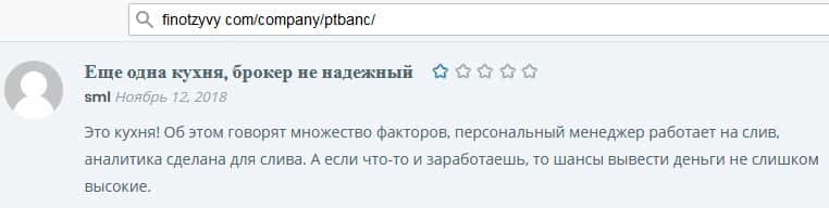 Если провести анализ более глубоко, то становится понятно, что PT Banc - это самая обычная кухня, а никакой не брокер, как они о себе пишут. Их персональный менеджер изначально работает на слив депозита клиента, а не на его увеличение. Клиента начинают обрабатывать с самого начала.